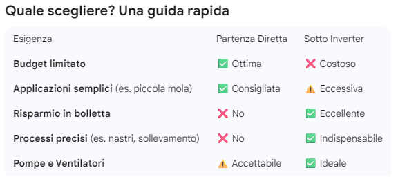 Oggi, con il calo dei prezzi dell’elettronica, l’inverter è quasi sempre la scelta migliore se il motore supera i 2-3 kW o se lavora molte ore al giorno. Il costo extra si ripaga spesso in meno di un anno grazie al minor consumo energetico e alla manutenzione ridotta.