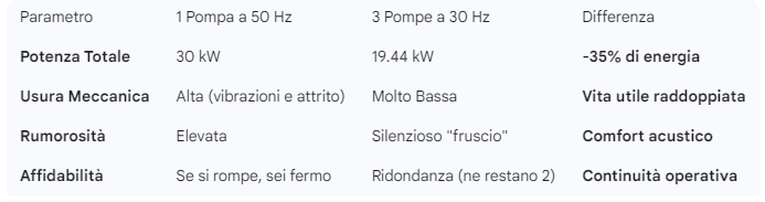 Facendo girare tre pompe “al piccolo trotto” invece di una al massimo, ottieni lo stesso risultato (pressione costante) ma consumi circa 10.5 kW in meno.