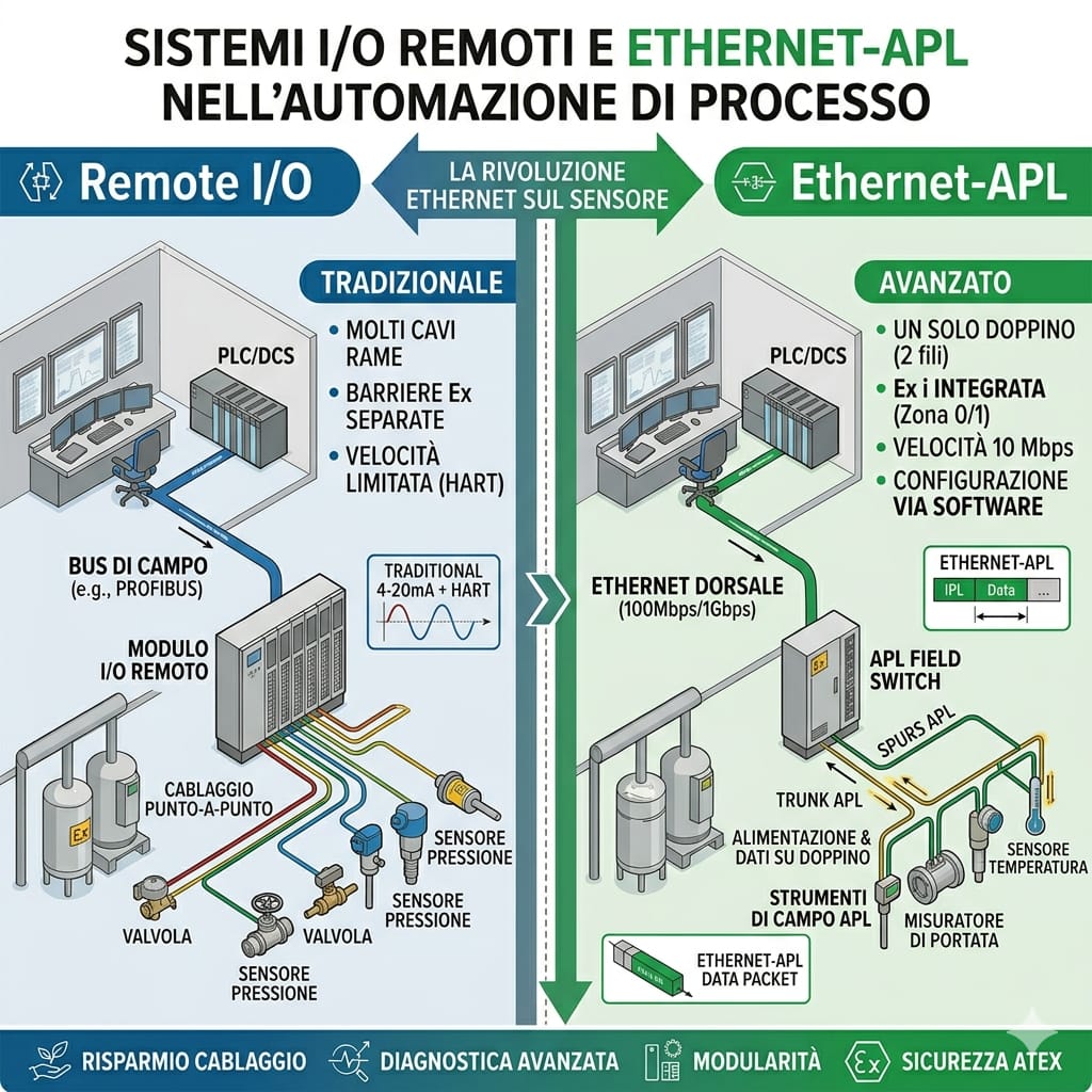 Con l’APL, il concetto di “I/O Remoto” si evolve. Invece di avere un modulo che traduce un segnale analogico (4-20mA) in digitale, lo strumento stesso parla la lingua del PLC/DCS.